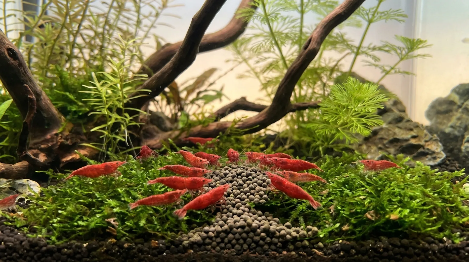 The amount should be tiny – think of a pinhead-sized portion of pellets for every 10-20 adult shrimp. Watch your colony’s behavior: if they swarm the food immediately and finish it quickly, you can maintain daily feeding. If food remains after an hour, reduce the quantity or frequency.