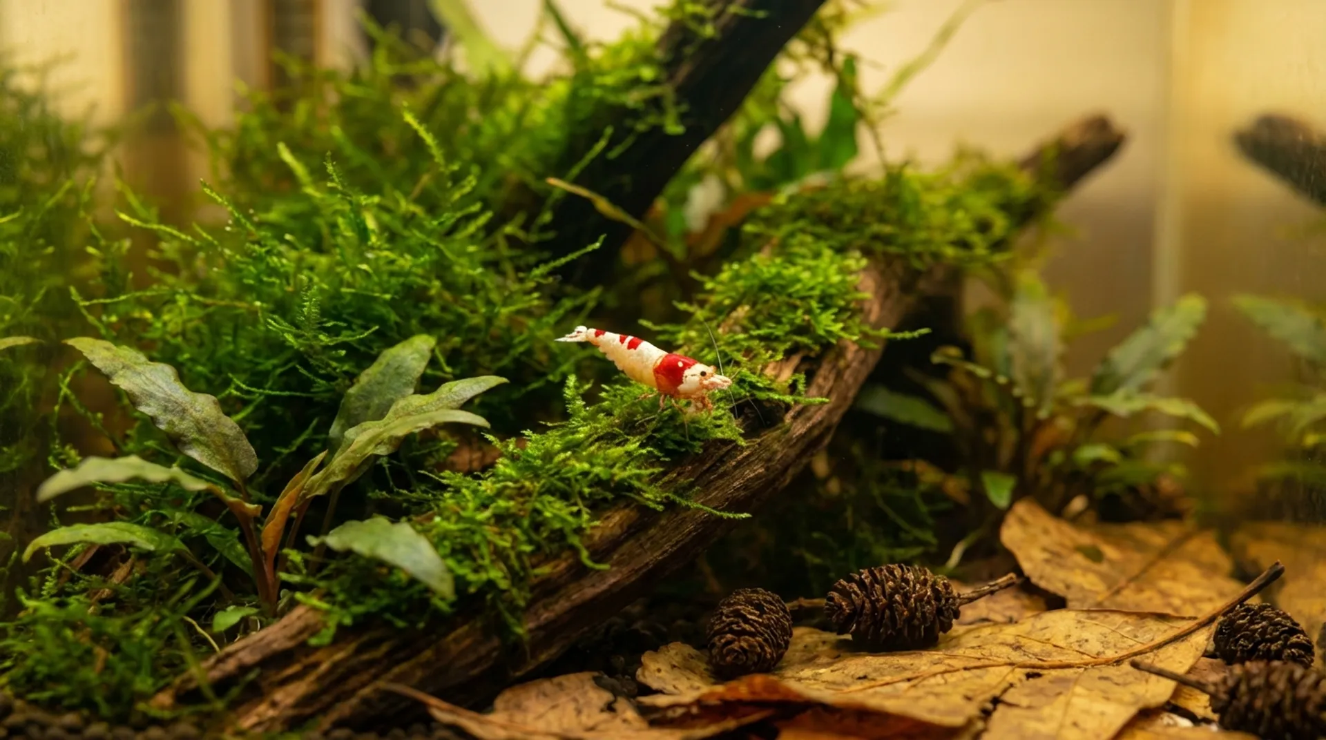 Almond leaves, oak leaves, and other botanicals contribute mild acidification while providing natural foods for shrimp. These methods work slowly but create stable, long-term pH reduction.